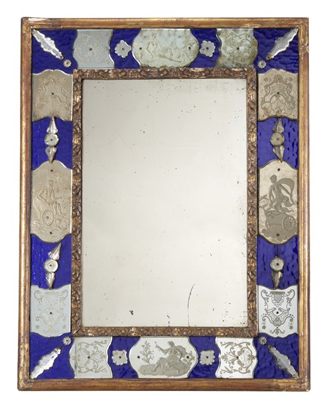 Specchiera con cornice a cassetta decorata da specchi incisi a figure mitologiche e volute fiorite su fondo in vetro blu, bordure in legno dorato. Secolo XVIII (cm 111x86) (difetti e lievi mancanze)