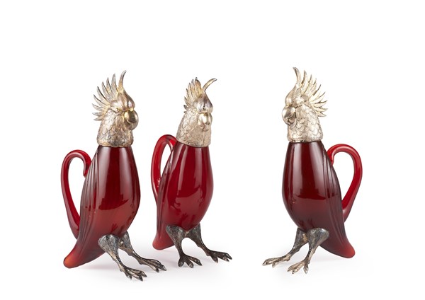 Gruppo di tre porta profumo in foggia di pappagalli con corpo in vetro rosso, testa e zampe in argento titolo 925 (h. cm 15,5) (difetti)
