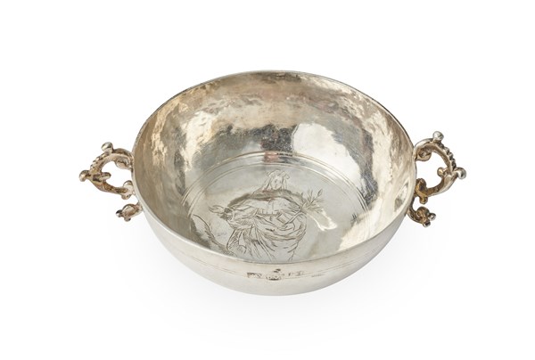 Coppetta biansata in argento a corpo liscio, figura di santa incisa nel cavetto. Trapani, secolo XVIII. Argentiere non identificato (d. cm 10) (g 100) (difetti ad un'ansa; restauri)