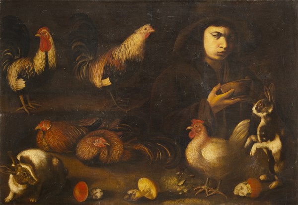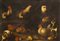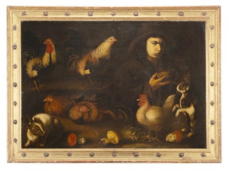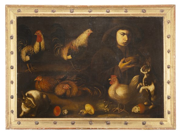 Scuola del secolo XVIII "Composizione con volatili, lepri, funghi e figura" ol