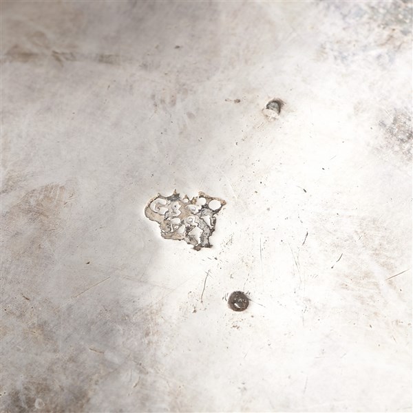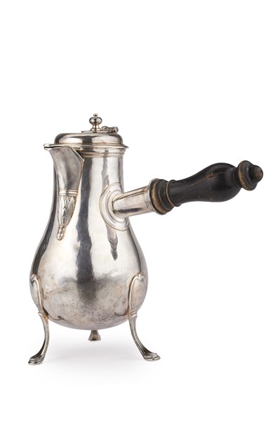 Cioccolatiera tripode di forma globulare in argento, manico in legno ebanizzato, presa del coperchio a trottola. Regno di Sardegna (?) (h. cm 25) (g lordi 830) (difetti)