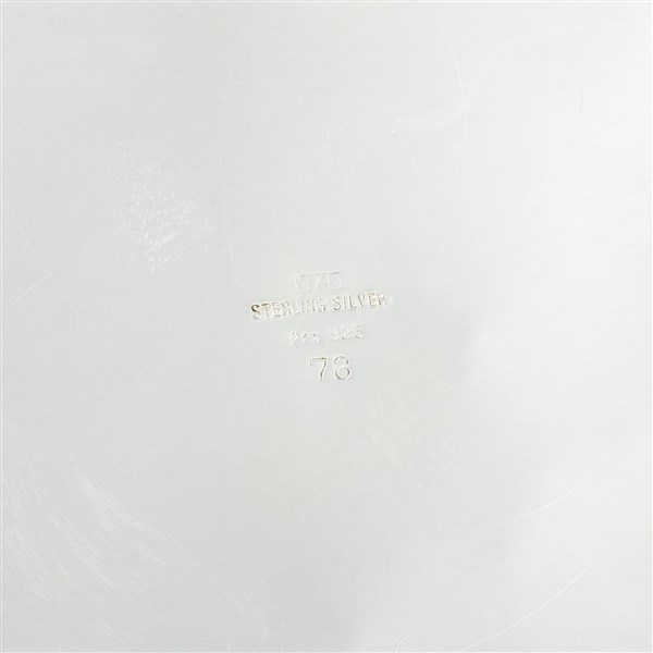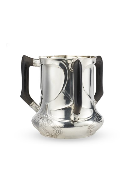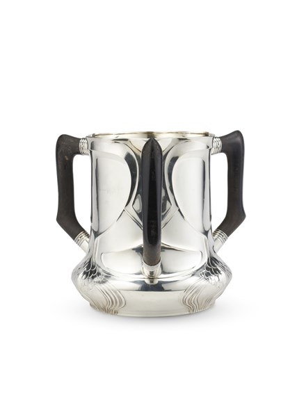 Coppa triansata in argento decorato a motivo Liberty a cuori stilizzati e motivi geometrici, interno in vermeil, anse in legno ebanizzato. Titolo 925, iscritto Sterling Silver con numerale 78. Argentiere O A G (h. cm 20,5) (g lordi 1200) (difetti)