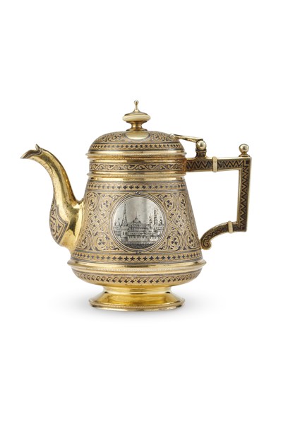 Teiera in argento dorato e niello riccamente decorata a volute fogliate con vedute della cattedrale di Cristo Salvatore e della Piazza Rossa di Mosca entro riserve circolari e perlinature. Manico squadrato sormontato da sfera, presa del coperchio a trottola e ghiere in avorio. Mosca, 1887. Argentiere Vasily Semenov. Reca "MADE FOR TIFFANY & CO" inciso alla base in epoca successiva (h. cm 14) (g 460) (difetti)
