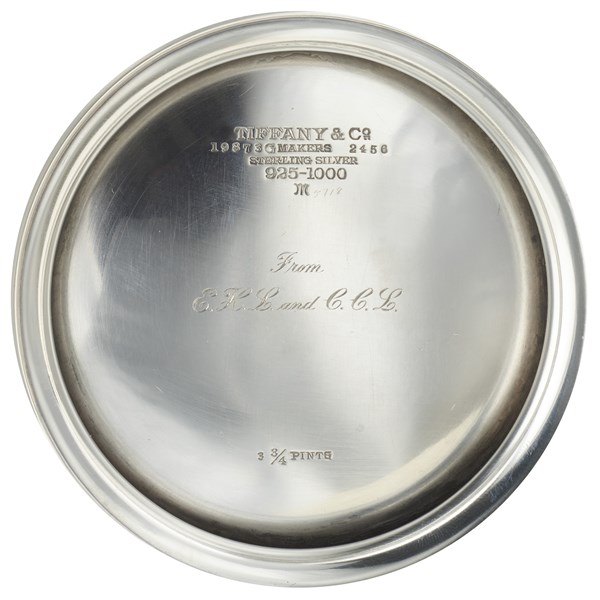 Caraffa in argento inciso e decorato a volute fogliate con datazione 1905 e 1930 entro stemma. Titolo 925. Marcata Tiffany & Co sotto la base (h. cm 18) (g 1000) (lievi difetti)