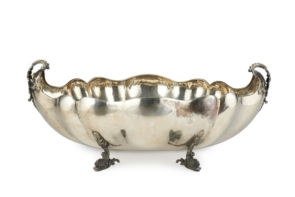 Centrotavola in argento a coppa baccellata e biansata a foglie, piedi a delfino