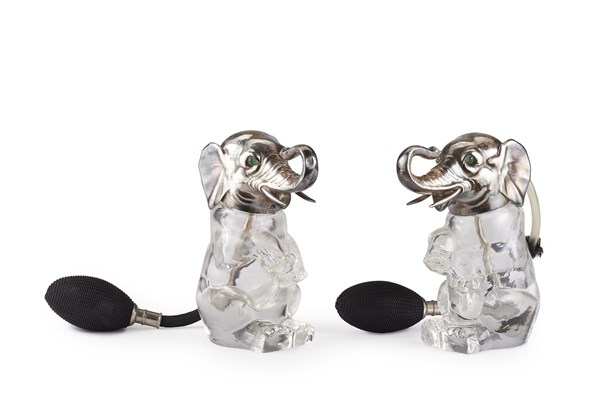 Lotto composto da due vaporizzatori in foggia di elefanti con corpo in vetro e testa in argento, occhi in pasta vitrea. Stati Uniti d'America, inizio secolo XX (h. cm 12,5) (difetti)