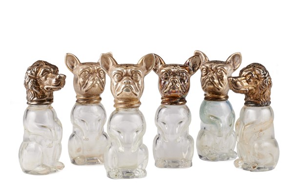 Lotto composto da sei saliere in foggia di cani con corpo in vetro e teste in argento, titolo 800. Punzoni di Milano, argentieri differenti (h. max cm 8 ca.) (lievi difetti)