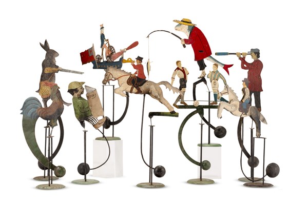 Manifattura inglese, inizio secolo XX. Lotto composto da nove dondoli giocattolo in metallo verniciato raffiguranti soggetti diversi tra cui un curioso pesce pescatore, giocatori di calcio ed un coniglio cacciatore, con basi (h. cm 55 ca.) (difetti)