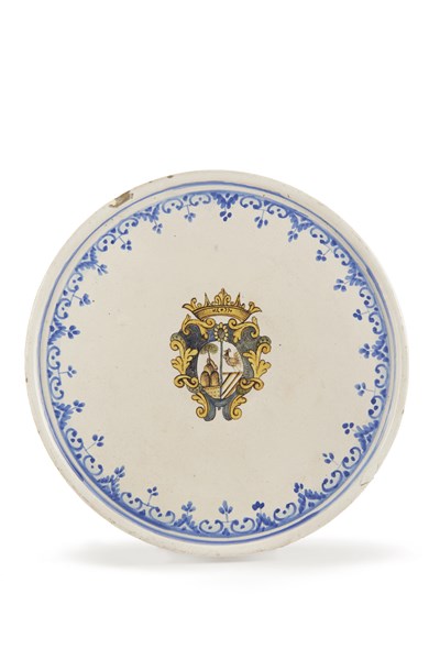 Faenza manufacture, 18th century. A polychrome majolica centerpiece decorated with coat of arms (d. 29 cm, h. 5 cm) (defects and minor restorations)