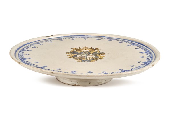 Manifattura di Faenza, secolo XVIII. Alzata in maiolica decorata con stemma araldico in policromia al centro, bordura in blu (d. cm 29, h. cm 5) (difetti e lievi restauri)