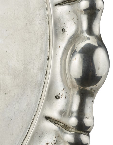 Grande vassoio ovale in argento sbalzato a bordo mistilineo. Inizio secolo XX (