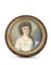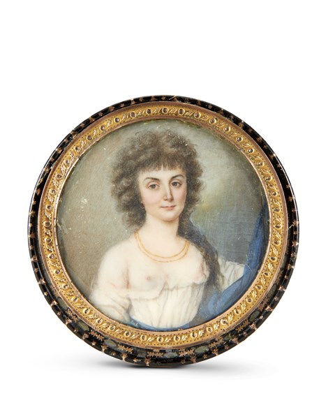 Tabacchiera di forma circolare in tartaruga con decoro a piqué, coperchio con miniatura raffigurante dama entro cornice in oro. Secolo XVIII (d. cm 7,5) (difetti)
