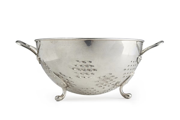 Scolapasta in argento a corpo liscio poggiante su tre piedi mossi. Titolo 800. Alessandria, argentiere Ricci e Cesa (d. cm 22,5) (g 760) (difetti)