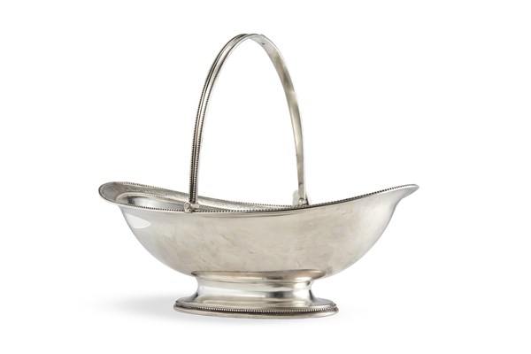 Cesto portafrutta in argento a corpo liscio. Bordo cesellato e decorato a perlinature, stemma inciso nel cavetto. Punzoni di Londra abrasi (L. cm 36) (g 1150) (difetti)
