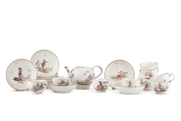 Manifatture europee, fine secolo XVIII. Parte di servizio da caffè composto da dieci tazzine, nove piattini e una teiera in porcellana decorata in policromia a figure popolari in paesaggi e fiori sparsi (difetti)