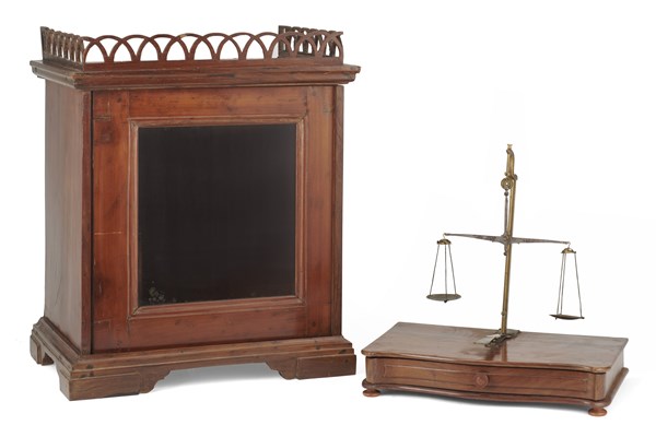 Bilancia per orafo entro vetrina in legno con anta a vetro, sormontata da cornice traforata. Accompagnata da vari pesi. Secolo XIX (cm 42,5x50x28,5) (difetti)