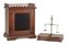 Bilancia per orafo entro vetrina in legno con anta a vetro, sormontata da corni