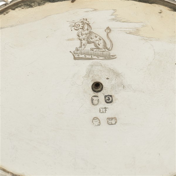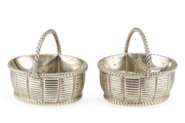 Due cestini in argento decorati a motivo intrecciato con vasca bipartita con tracce di doratura. Uno con punzoni di Londra, 1802, l'altro con punzoni poco leggibili (cm 9x8x8) (g 390) (difetti)