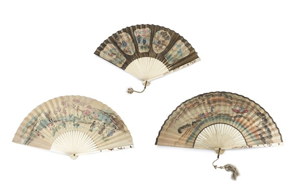 Giappone, periodo Edo, secolo XIX. Lotto di tre ventagli con stecche in avorio