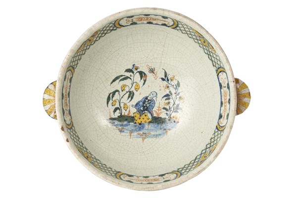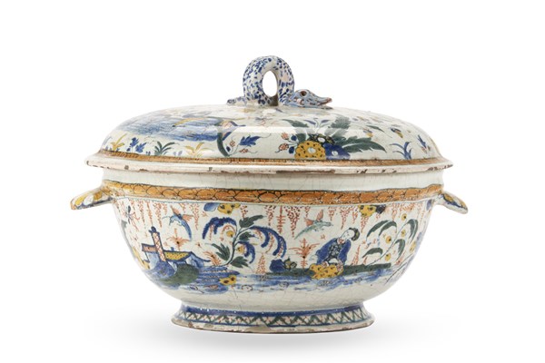 Manifattura di Rouen, secolo XVIII. Zuppiera circolare biansata con coperchio i
