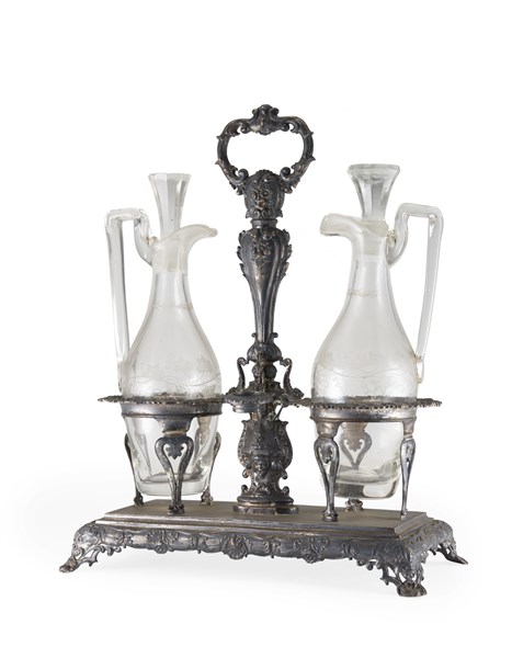Oliera in argento con base rettangolare su piedi mossi, sostegno centrale con presa ad anello, decori a fiori, mascheroni e valve di conchiglia. Milano, secolo XIX (g 560) Due ampolle in vetro con tappo (h. cm 33) (lievi difetti)