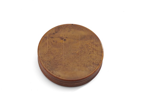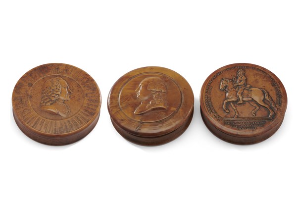Arte del secolo XIX. Lotto composto da tre tabacchiere in acero pressato con coperchi scolpiti a profilo maschile, figura a cavallo e Voltaire. Interni in tartaruga (d. max cm 8,5) (difetti)