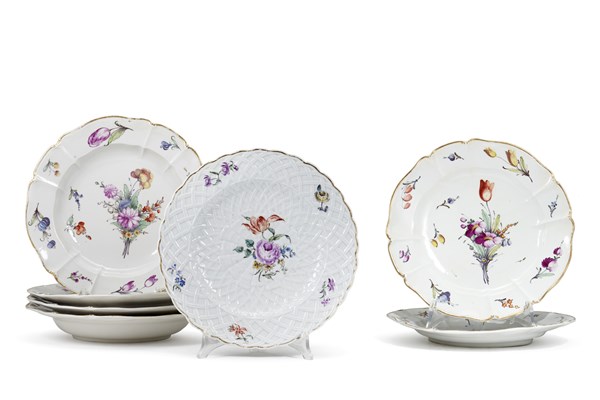 Manifattura di Nymphenburg, secolo XVIII. Lotto composto da sei diversi piatti con decoro floreale in policromia e profili in oro. Unito a un piatto a canestro con stesso decoro (d. max cm 24) (difetti)
