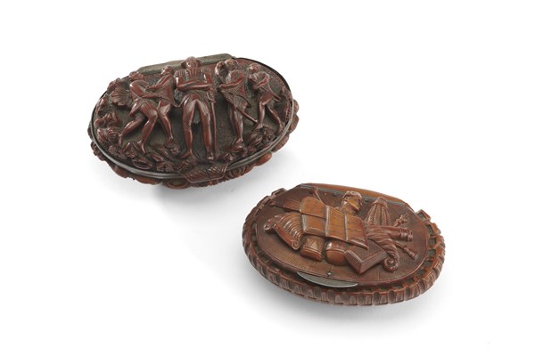 Arte del secolo XIX. Due tabacchiere in legno intagliato raffiguranti Napoleone di profilo e scena napoleonica (L. max cm 8) (difetti)