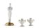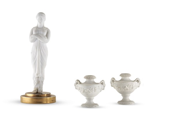 Manifattura di Vienna, secolo XIX. Coppia di vasetti biansati a testa d'ariete in biscuit con festoni di fiori a rilievo unita a figura di vestale in biscuit su base in porcellana dorata di differente manifattura (h max tot. cm 16,5) (difetti)
