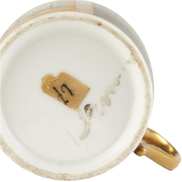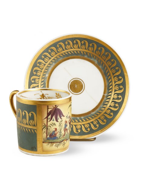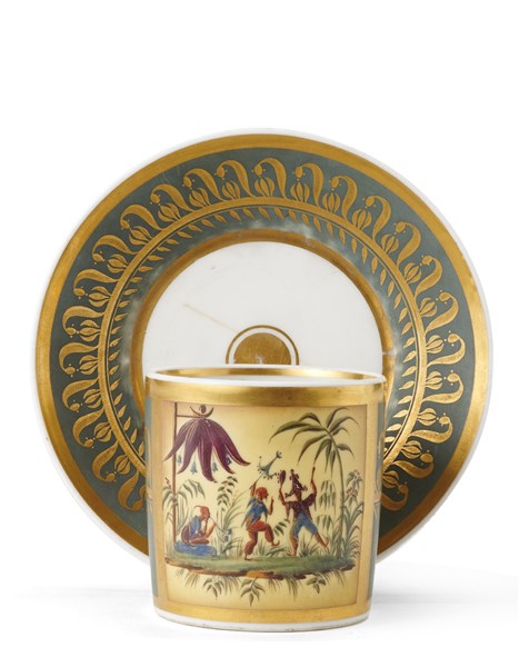 Manifattura francese, secolo XIX. Tazzina con piattino in porcellana dipinta in