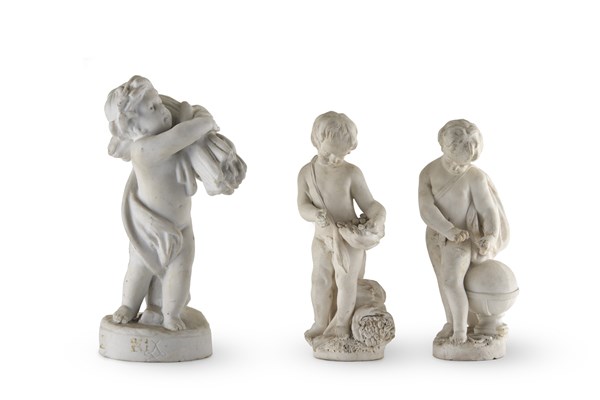 Manifattura francese, secolo XVIII. Coppia di figure di putti allegorici in biscuit; uniti a figura di putto allegorico dell'estate reggente fascio di spighe, manifattura di Sèvres, secolo XIX, marchio impresso sul fronte (h. max cm 15,5) (difetti)
