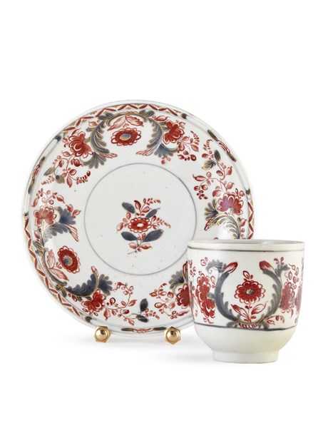 Manifattura di Cozzi, Venezia, secolo XVIII. Tazza con piattino in porcellana dipinta nei toni del blu e rosso a motivi vegetali con dettagli dorati. Marchio di fabbrica alla base (difetti)