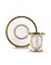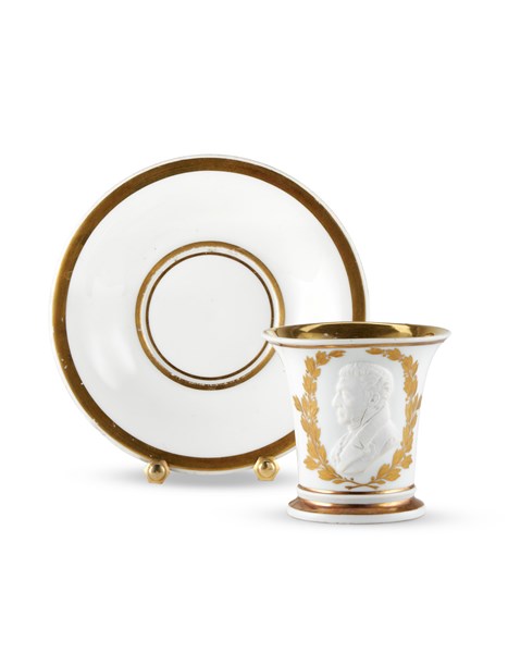 Manifattura di Meissen, secolo XIX. Tazza con piattino in porcellana decorata con profilo maschile a rilievo in biscuit entro corolla e profili in oro (lievi difetti)