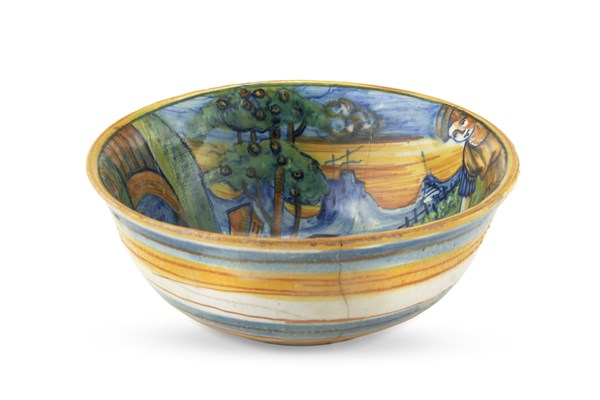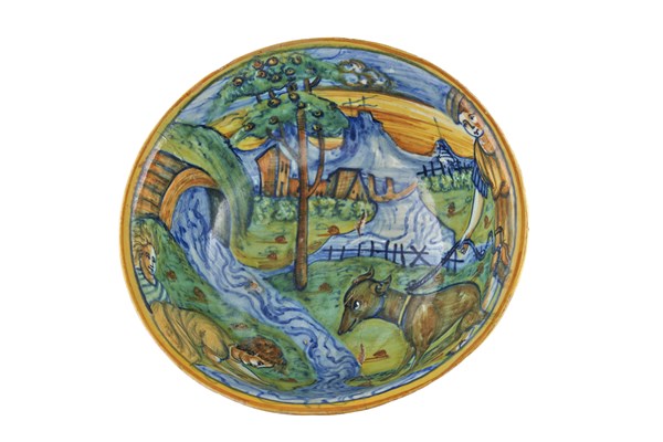Manifattura della fine del secolo XVI. Ciotola in maiolica con cavetto decorato in policromia a paesaggio con figure allegoriche e cane (d. cm 13; h. cm 5) (ricomposta)