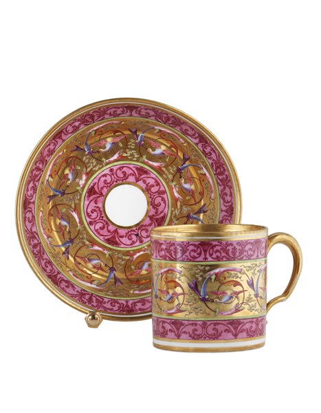 Manifattura francese, secolo XIX. Tazza con piattino in porcellana decorata in policromia a volute e volatili su fondo oro e rosa (d. max cm 14) (lievi difetti)