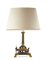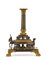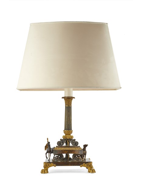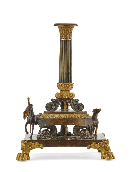Candeliere in bronzo brunito e dorato a colonna tripode scanalata poggiante su base sagomata sorretta da mostri marini. Sostegno rettangolare decorato da cane e cavallo recante vessillo inciso TB a tutto tondo, su piedi ferini. Secolo XIX (h. cm 32) (difetti e restauri)
