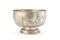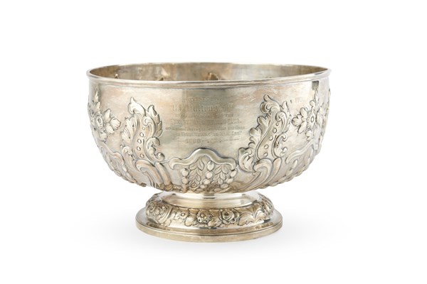 Centrotavola in argento a coppa sbalzata a rocaille e volute fiorite, fronte con dedica incisa. Titolo 925. Londra, 1903 (d. cm 24; h. cm 15,5) (g 760) (lievi difetti)