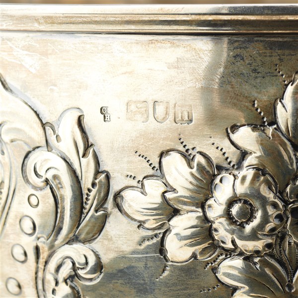 Centrotavola in argento a coppa sbalzata a rocaille e volute fiorite, fronte co