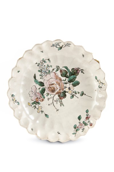 Manifattura di Jacques Boselly (Giacomo Boselli 1744-1808) Savona, secolo XVIII. Ciotola a profilo polilobato in maiolica decorata in policromia a motivo floreale, firmato al retro (d. cm 24) (lievi difetti)