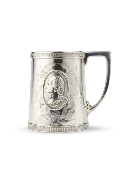Mug in argento a corpo liscio con profilo di gentiluomo in rilievo entro ovale