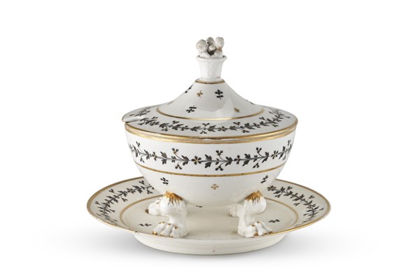 Manifattura della prima metà secolo XIX. Salsiera con coperchio in porcellana decorata a fiori stilizzati in grisaglia e bordi in oro, piedi ferini, presa del coperchio in biscuit con putti in un cesto (difetti)