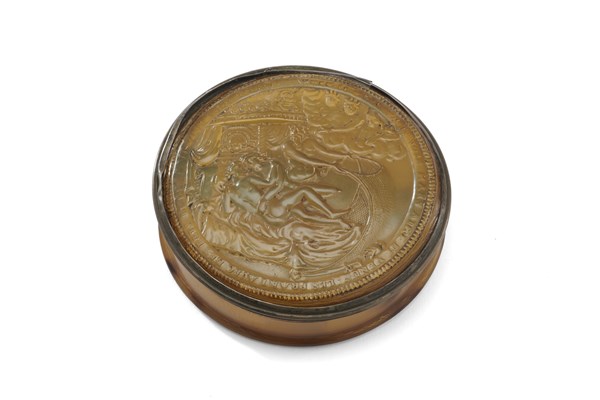 Nello stile di John O'Brisset, secolo XVIII. Tabacchiera in tartaruga bionda con coperchio scolpito raffigurante Vulcano e gli dei che scoprono Venere tra le braccia di Marte, ghiera in argento (d. cm 7) (difetti)