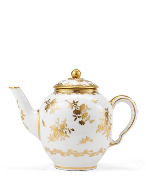 Manifattura di Sèvres, secolo XVIII. Teiera con coperchio in porcellana. Corpo globulare con presa a frutto, decori a motivo floreale e profili in oro (h. cm 13) (lievi difetti)