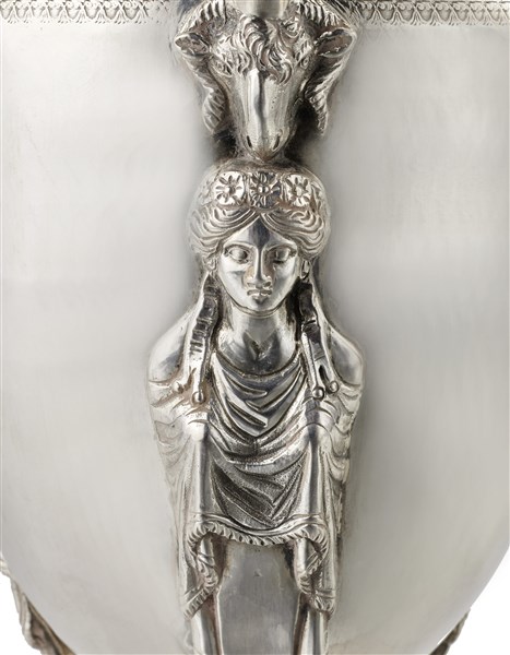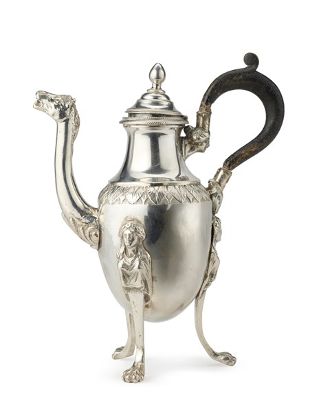 Caffettiera solitaire in argento con corpo ovoidale e sostegno tripode con attaccature a erma e piedi ferini, versatoio zoomorfo, manico in legno ebanizzato con attaccature a volto muliebre e testa di ariete, bordura a foglie. Napoli, 1820 ca. (h. cm 18) (g lordi 360) (difetti)