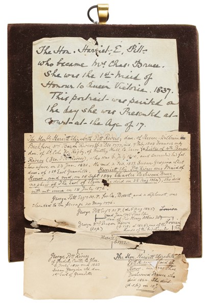 Arte del secolo XIX. Quattro diverse miniature su avorio raffiguranti gentildonne tra le quali una rettangolare dI Hariett Elizabeth Pitt Rivers all'età di 17 anni (d. max cm 10,5x8) in cornici (difetti)