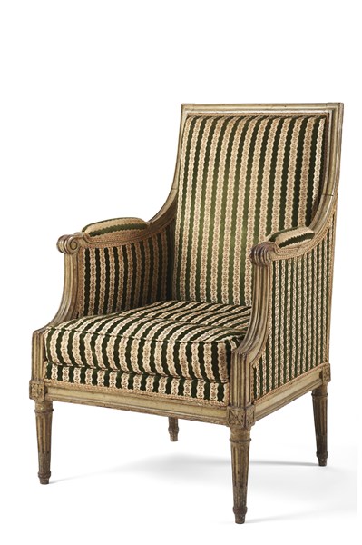 Jean Baptiste Bernard Demay (1759-1848) Poltrona in legno intagliato e laccato con braccioli terminanti a ricciolo, montanti e gambe scanalate (cm 64,5x95,5x55) Stampigliata J.B.B. Demay. Secolo XVIII (difetti)