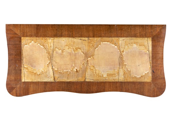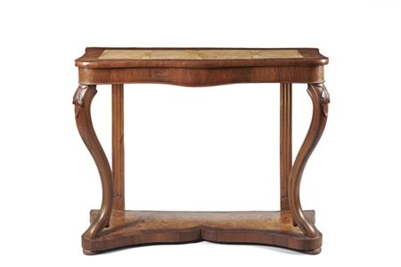 Console lastronata di forma sagomata con piano decorato al centro da pietra paesina incastonata, montanti anteriori mossi e posteriori scanalati poggianti su mensola con pannello in radica. Secolo XIX (cm 116x90x54) (difetti)