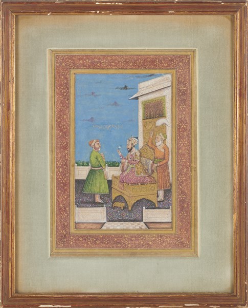 Arte persiana del secolo XIX. Pagina miniata dipinta in policromia e doratura con scena della vita di Shah Jahan (cm 27x20) In cornice (difetti)