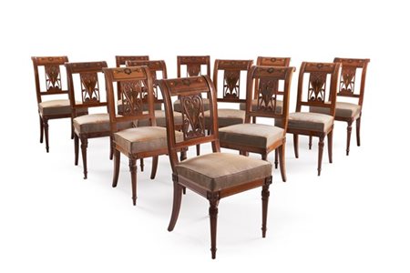 Coppia di sedie in mogano intarsiato, schienali con cartella in parte traforata decorata da motivo a palmetta, gambe tornite. Secolo XIX. Recanti stampigliatura Jacob Frères rue Meslée. Unite ad altre dieci di simil decoro di epoca posteriore (difetti)
