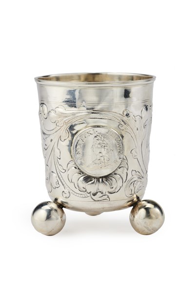 Silver glass with spherical feet, body decorated with three medals depicting : Pope Paul III, Charles X King of Sweden and Albert III Duke of Saxony. Habsburg, early 19th century (h. cm 9) (g 90) (defects)